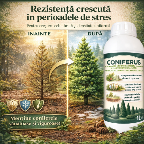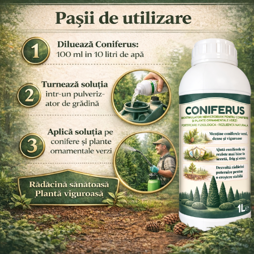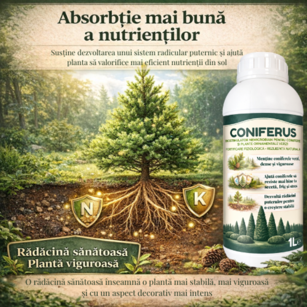 Coniferus este un biostimulator pentru conifere și plante ornamentale care susține procesele naturale ale plantei și ajută la menținerea unui aspect sănătos și verde.