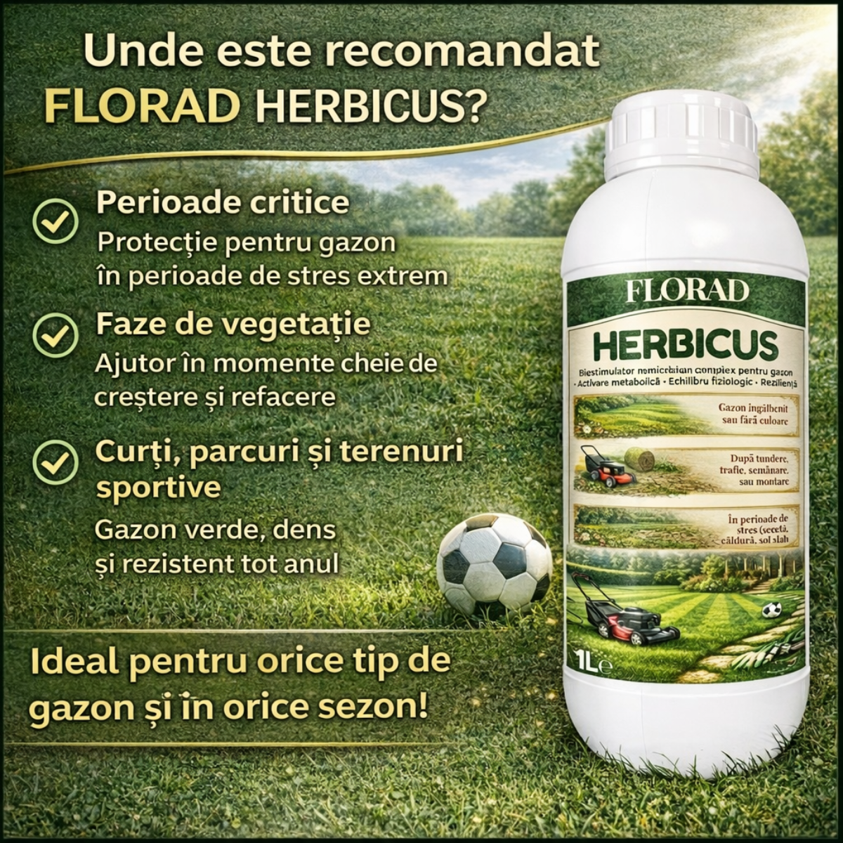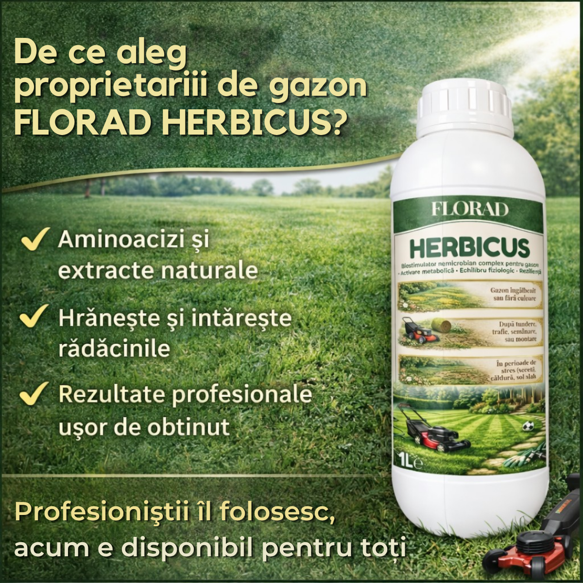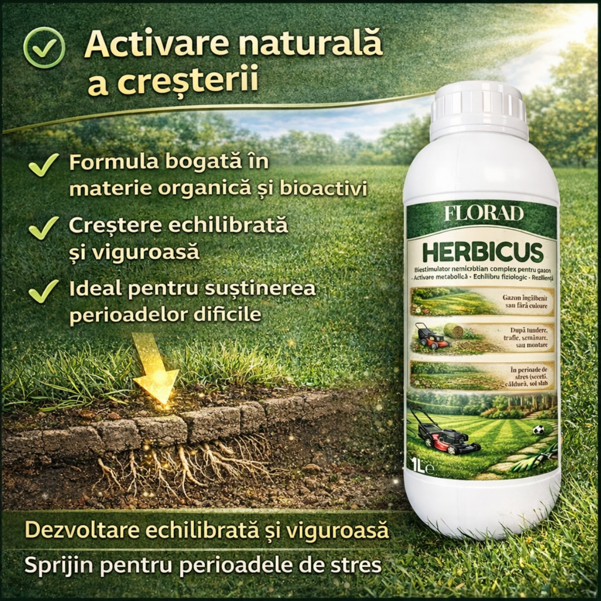 HERBICUS este un biostimulator profesional creat special pentru gazon, formulat cu aminoacizi și extracte naturale care reactivează rădăcinile și stimulează creșterea de fire noi.