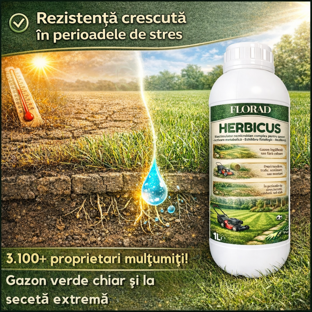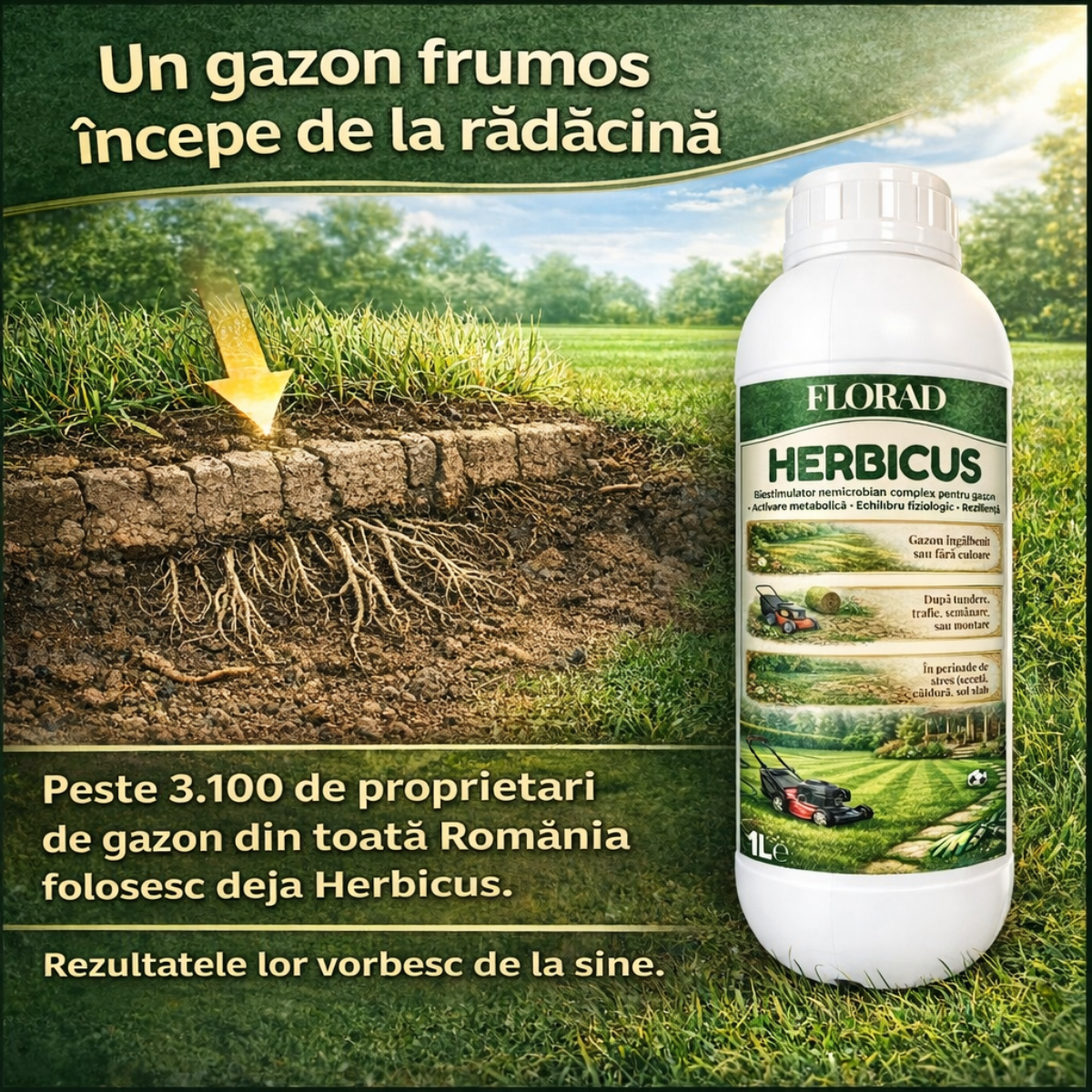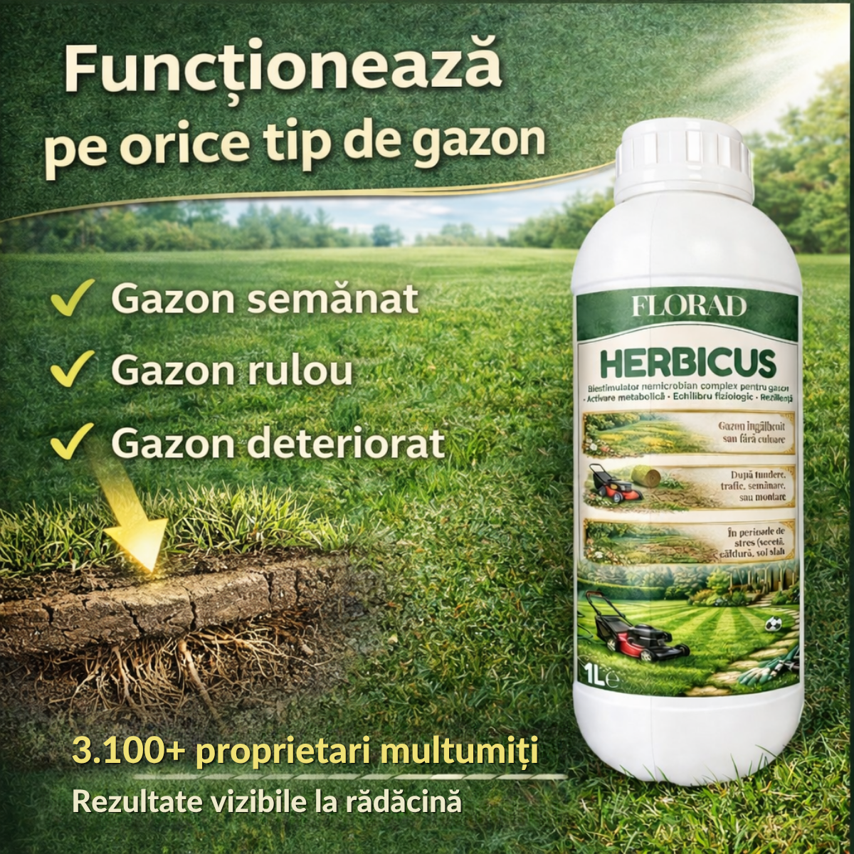 Majoritatea produselor pentru gazon sunt simple îngrășăminte chimice - pun nutrienți la suprafață și efectul dispare în câteva zile. Herbicus e diferit: este un biostimulator care acționează la nivel de rădăcină, reactivând capacitatea ierbii de a se regenera singură. De aceea rezultatele durează și se acumulează cu fiecare aplicare.