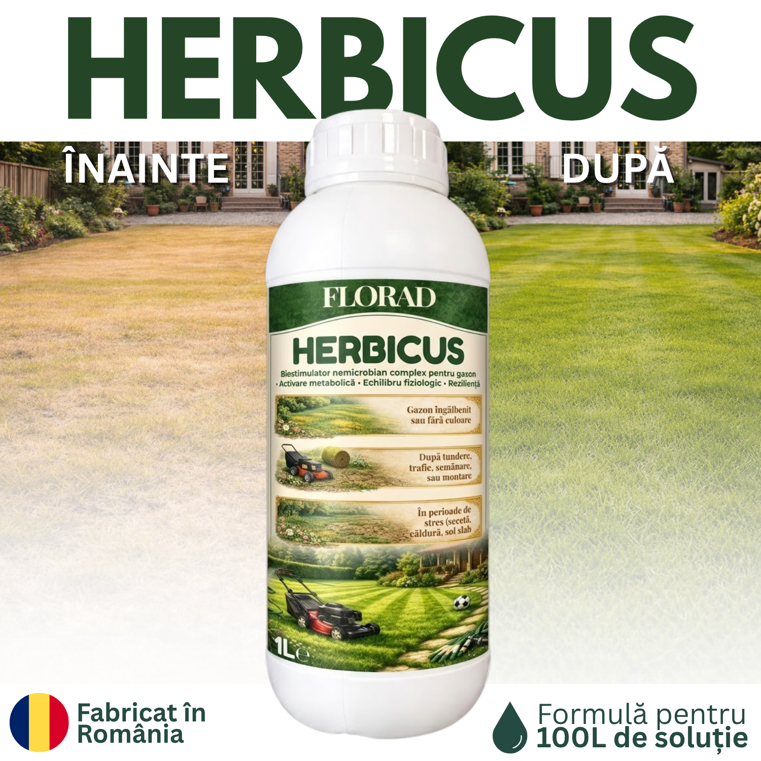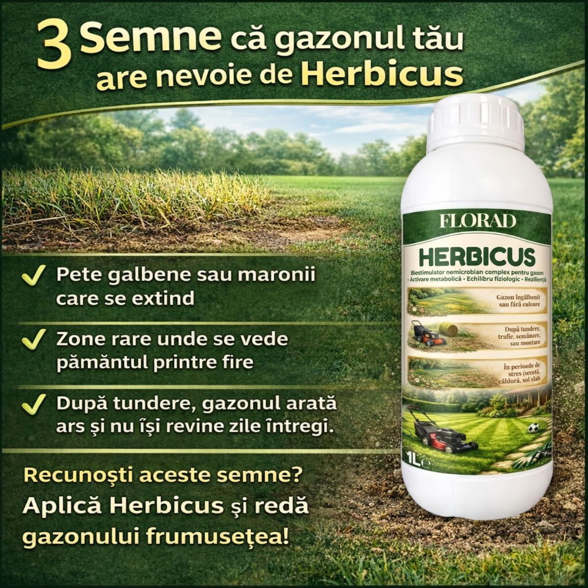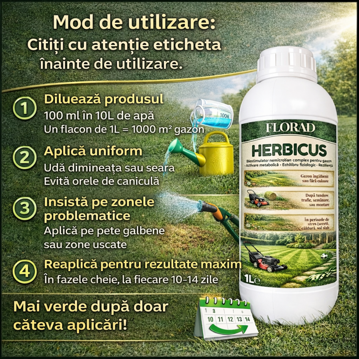 Majoritatea produselor pentru gazon sunt simple îngrășăminte chimice - pun nutrienți la suprafață și efectul dispare în câteva zile. Herbicus e diferit: este un biostimulator care acționează la nivel de rădăcină, reactivând capacitatea ierbii de a se regenera singură. De aceea rezultatele durează și se acumulează cu fiecare aplicare.