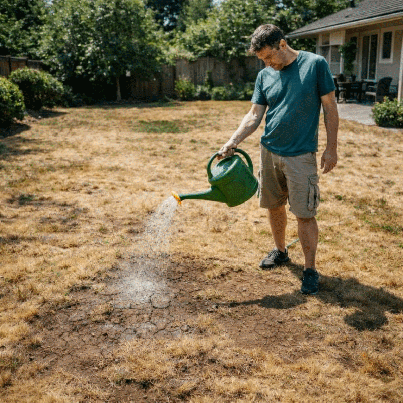 Când iarba se îngălbenește, e deja târziu. Înseamnă că rădăcina a încetat să mai absoarbă apă și nutrienți. Poți să-l uzi de 3 ori pe zi, apa se evaporă, iar gazonul continuă să se usuce.