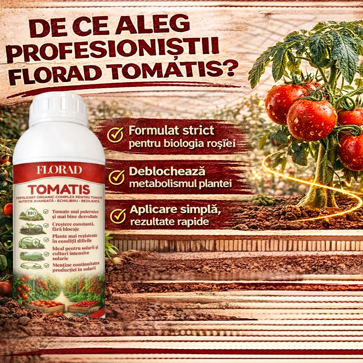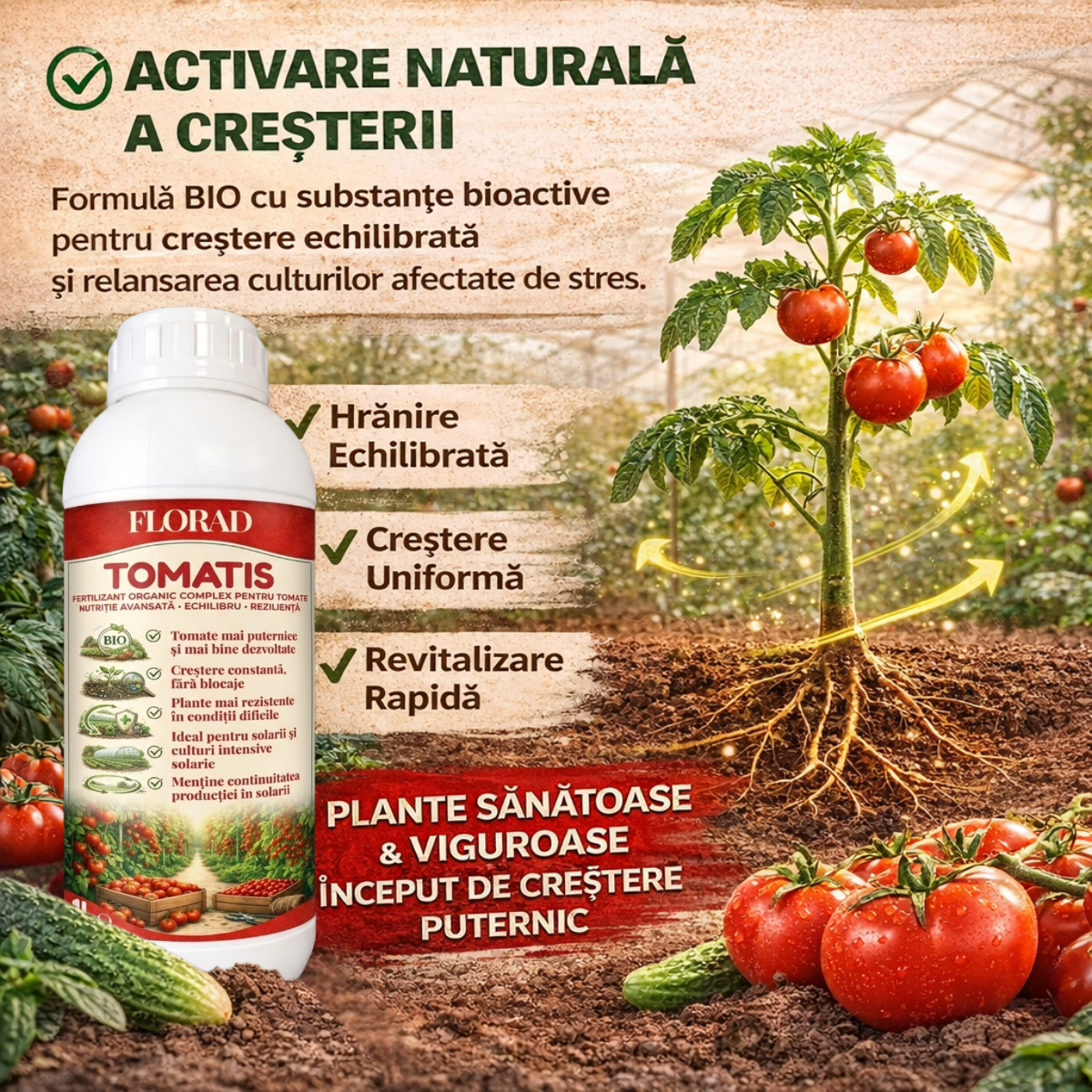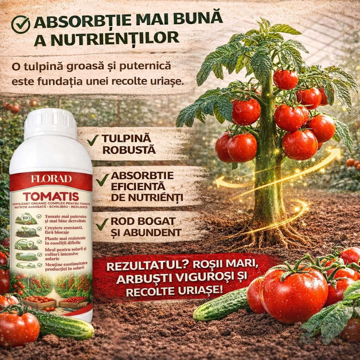 Tomatis deblochează planta. Îi reactivează metabolismul, o forțează să absoarbă tot ce are în sol și să transforme acea hrană în roșii mari, cărnoase și dulci.
