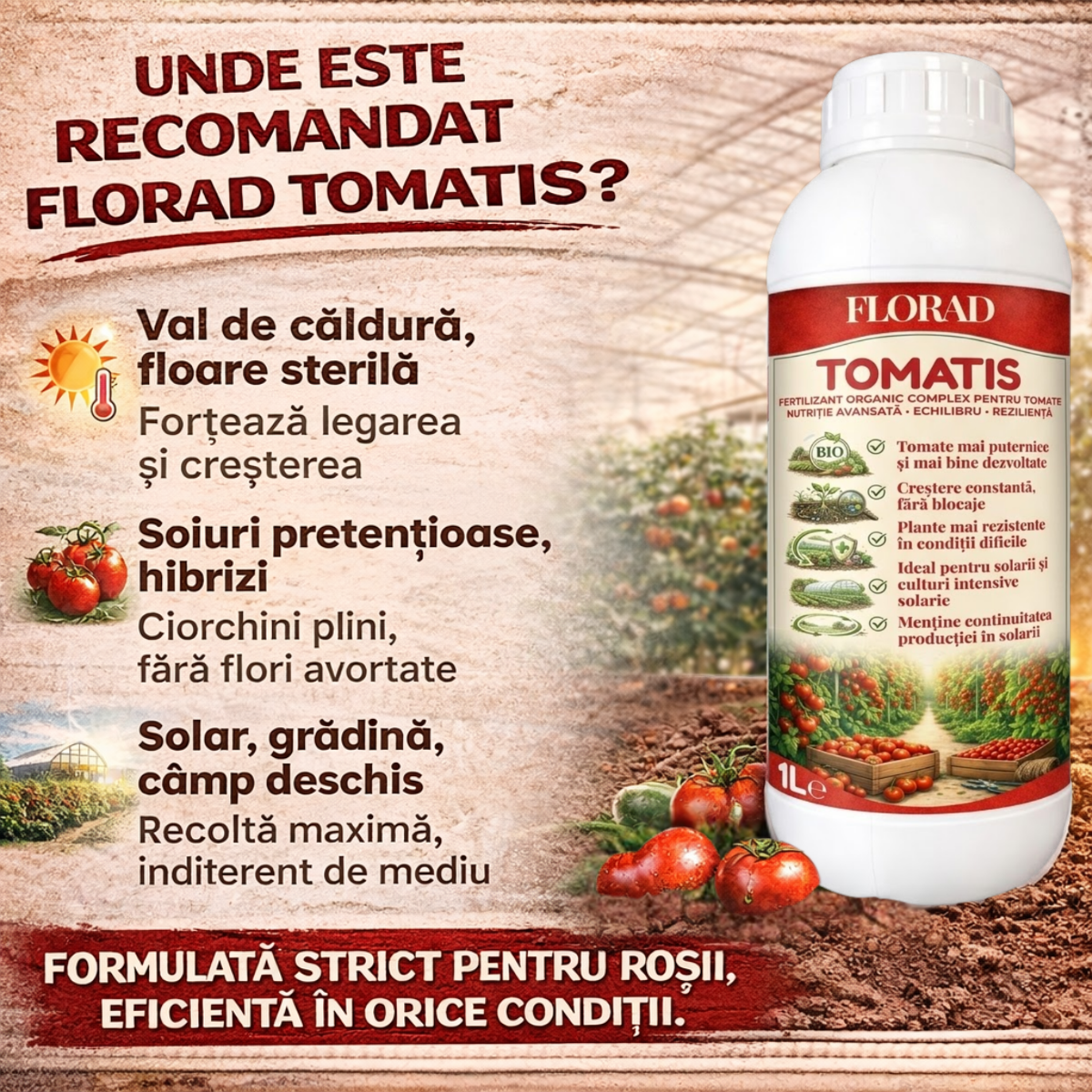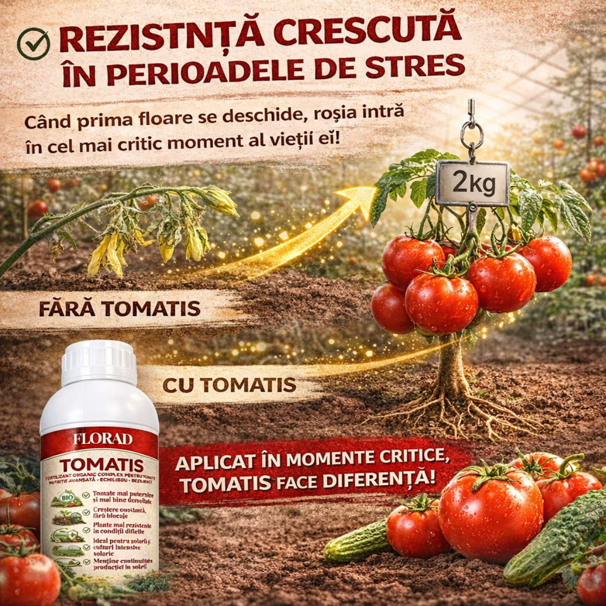 Tomatis intervine exact în acest moment critic. Forțează planta să lege fruct chiar și în condiții extreme — caniculă, nopți calde, umiditate scăzută. Fiecare floare devine roșie.