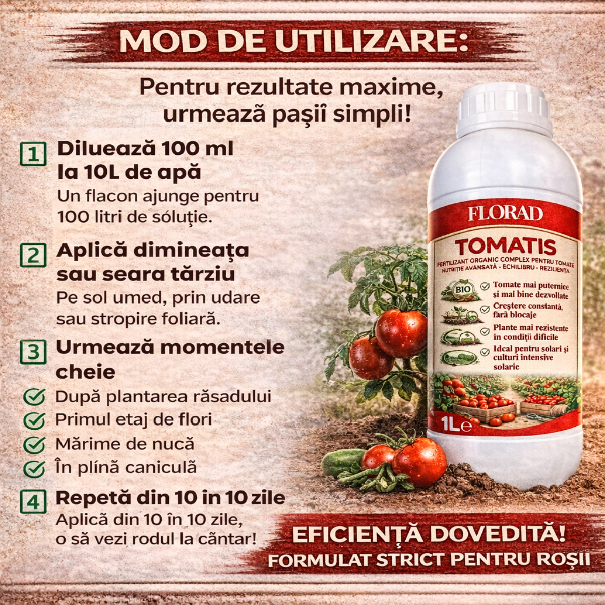 Doza șoc: 100 ml Tomatis la 10 litri de apă. Un flacon de 1L îți ajunge pentru 10 pompe (100 litri de soluție), suficient pentru tot sezonul.