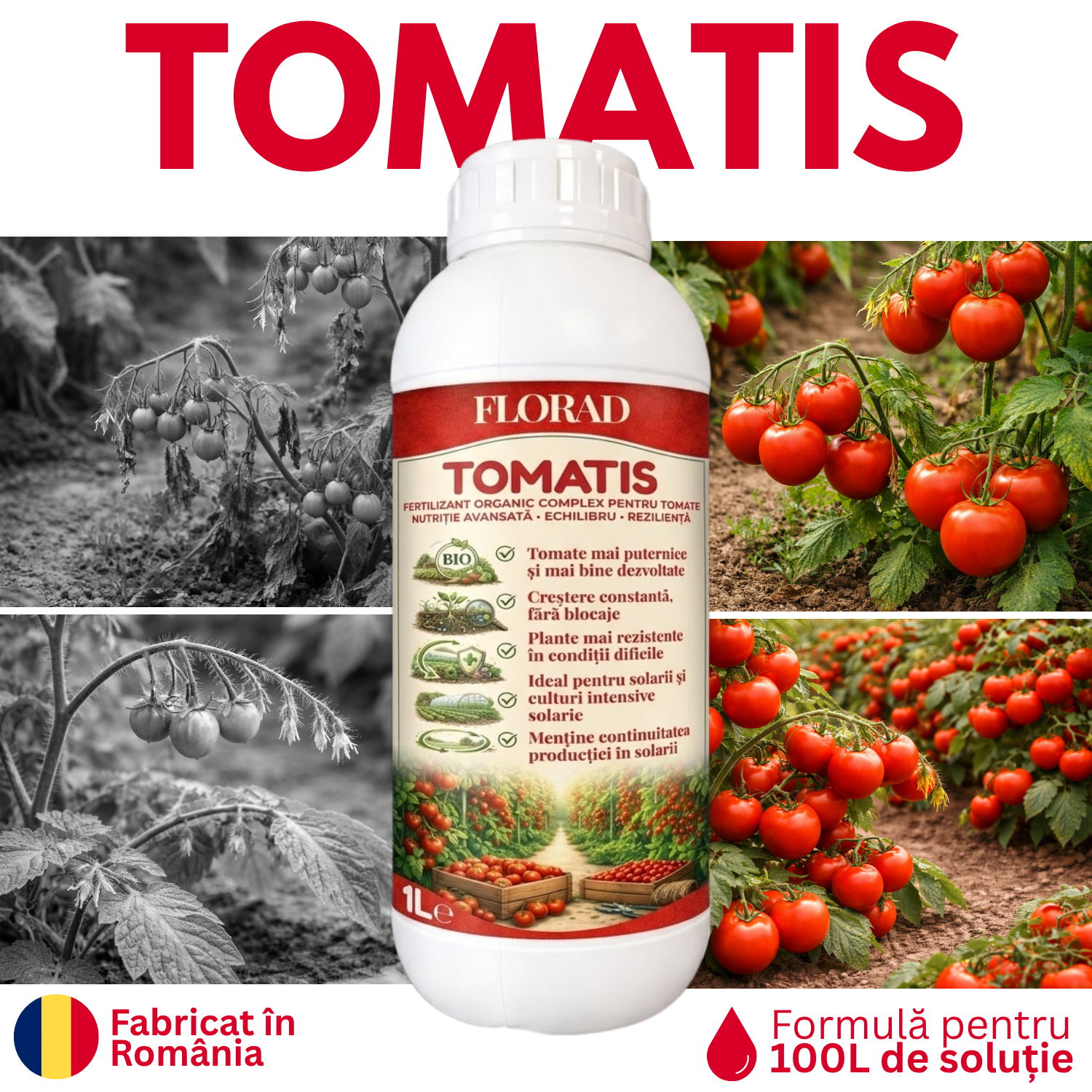 TOMATIS este cel mai puternic biostimulator creat vreodată în România, EXCLUSIV pentru cultura de tomate. Nu facem compromisuri cu formule universale.